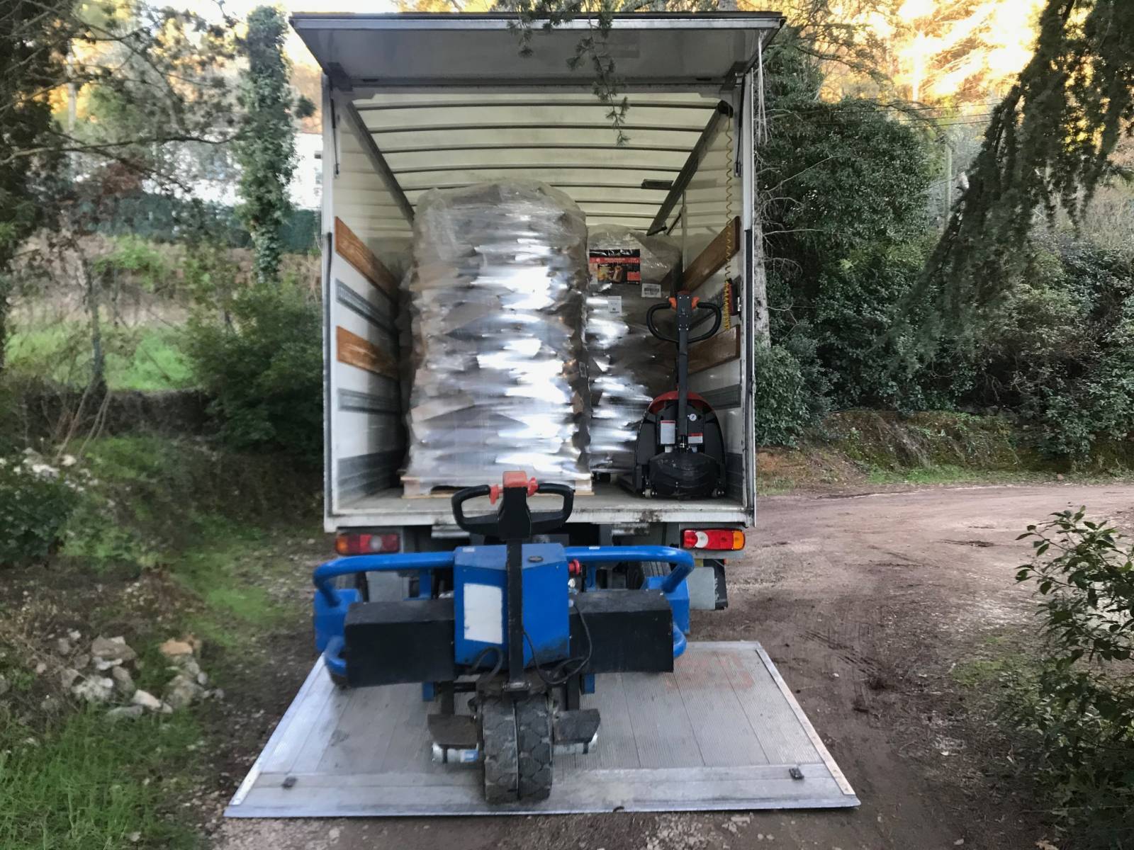 Livraison à domicile de palettes de bois de chauffage, granulés de bois et bûches densifiées avec transpalette électrique tout terrain.